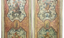 Coppia di porte ad un battente in legno dipinto decorate a motivi fogliacei, vasi e figure orientali al centro; cornici modanate in legno dorato. Il retro…