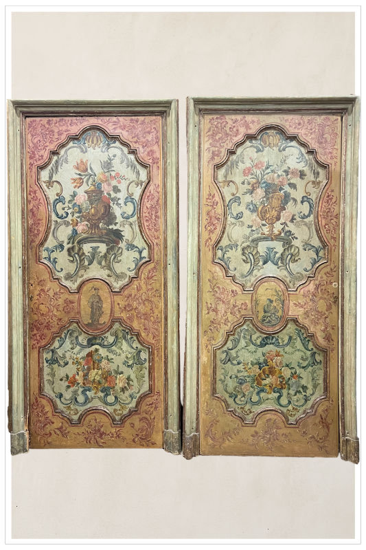 Coppia di porte ad un battente in legno dipinto decorate a motivi fogliacei, vasi e figure orientali al centro; cornici modanate in legno dorato. Il retro delle porte è laccato bianco.