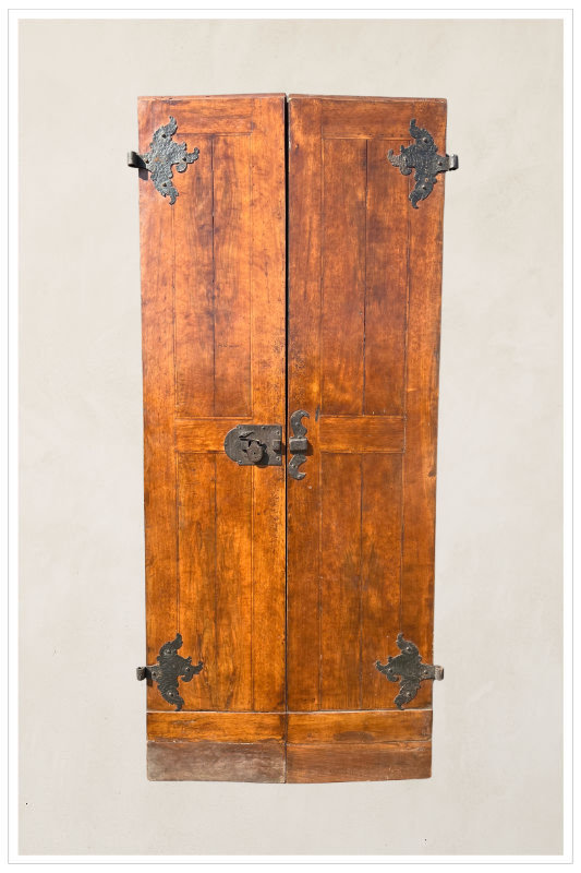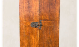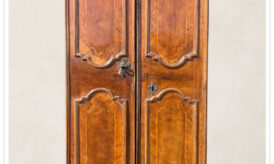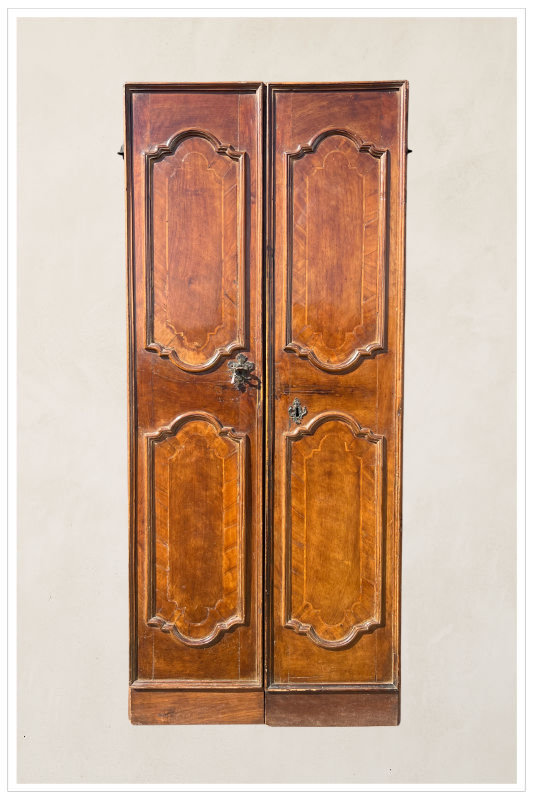 Bella porta di area lombarda in legno di noce e lastronatura, formelle con filettature in legno chiaro contornate da cornici intagliate. Filettata e patinata anche…